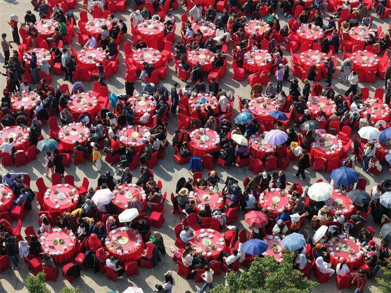 本次“九大碗”民俗活动席开166桌,其中红堰广场设112桌、九大碗广场设54桌,宴席菜品精心搭配、鲜香兼备,由“鸿运当头”“招财进宝”“五谷丰登”“年年有余”“蒸蒸日上”“节节高升”等14道寓意吉祥的特色佳肴组成,红亮的荤菜醇厚入味,清爽的素菜解腻适口,每一道菜都承载着美好的祝福。大家围坐在一起谈笑风生,品味着浓香菜肴,感受着团圆温情,一派热闹祥和的新春景象。