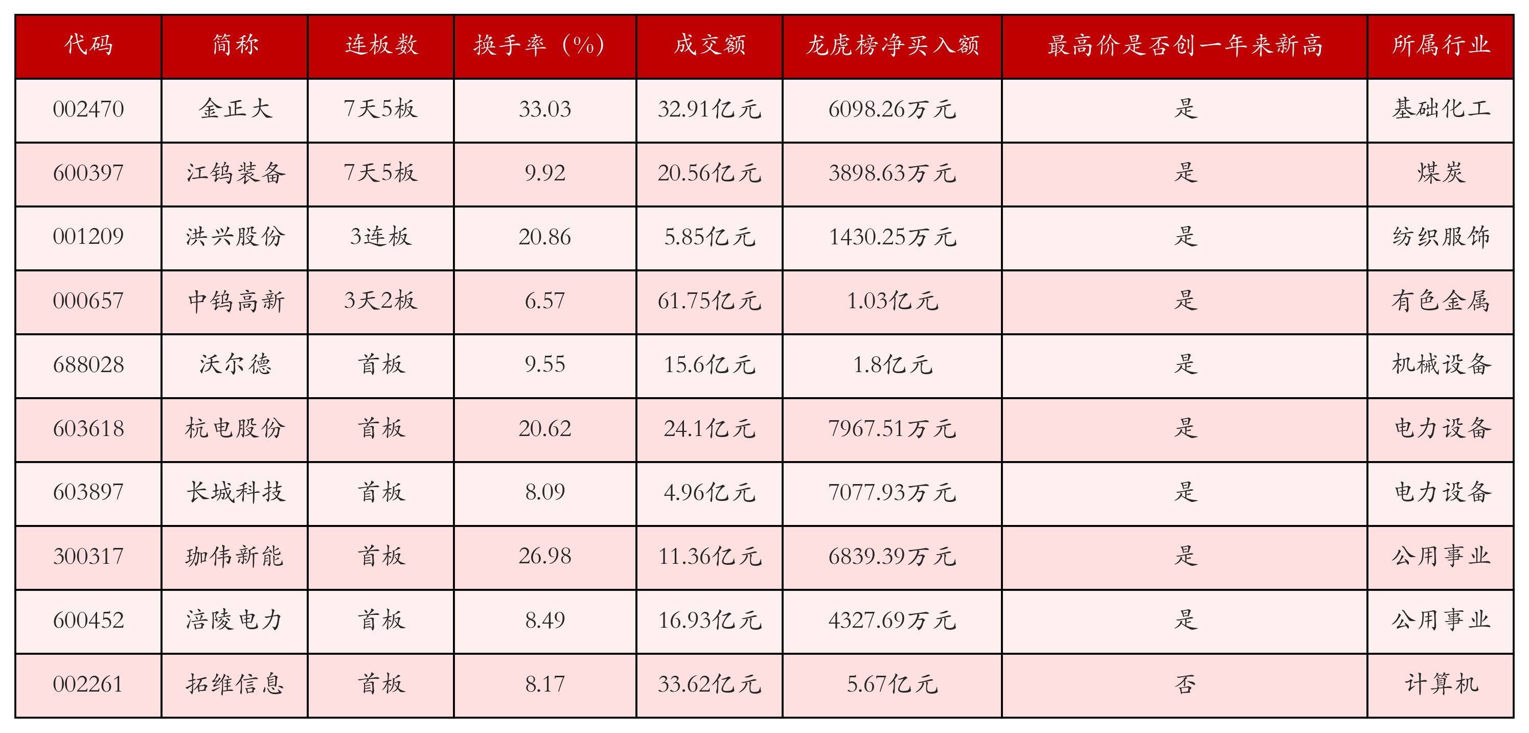 截至2月27日收盘,上证综指上涨0.39%,收于4162.88点,深证成指下跌0.06%,收于14495.09点,创业板指下跌1.04%,收于3310.3点。今日沪深两市A股共计92只涨停,综合当前连板数以及当日龙虎榜数据,其中较为强势的前三只个股分别为:金正大(002470)、江钨装备(600397)与洪兴股份(001209)。今日强势个股前10位具体数据见下表: