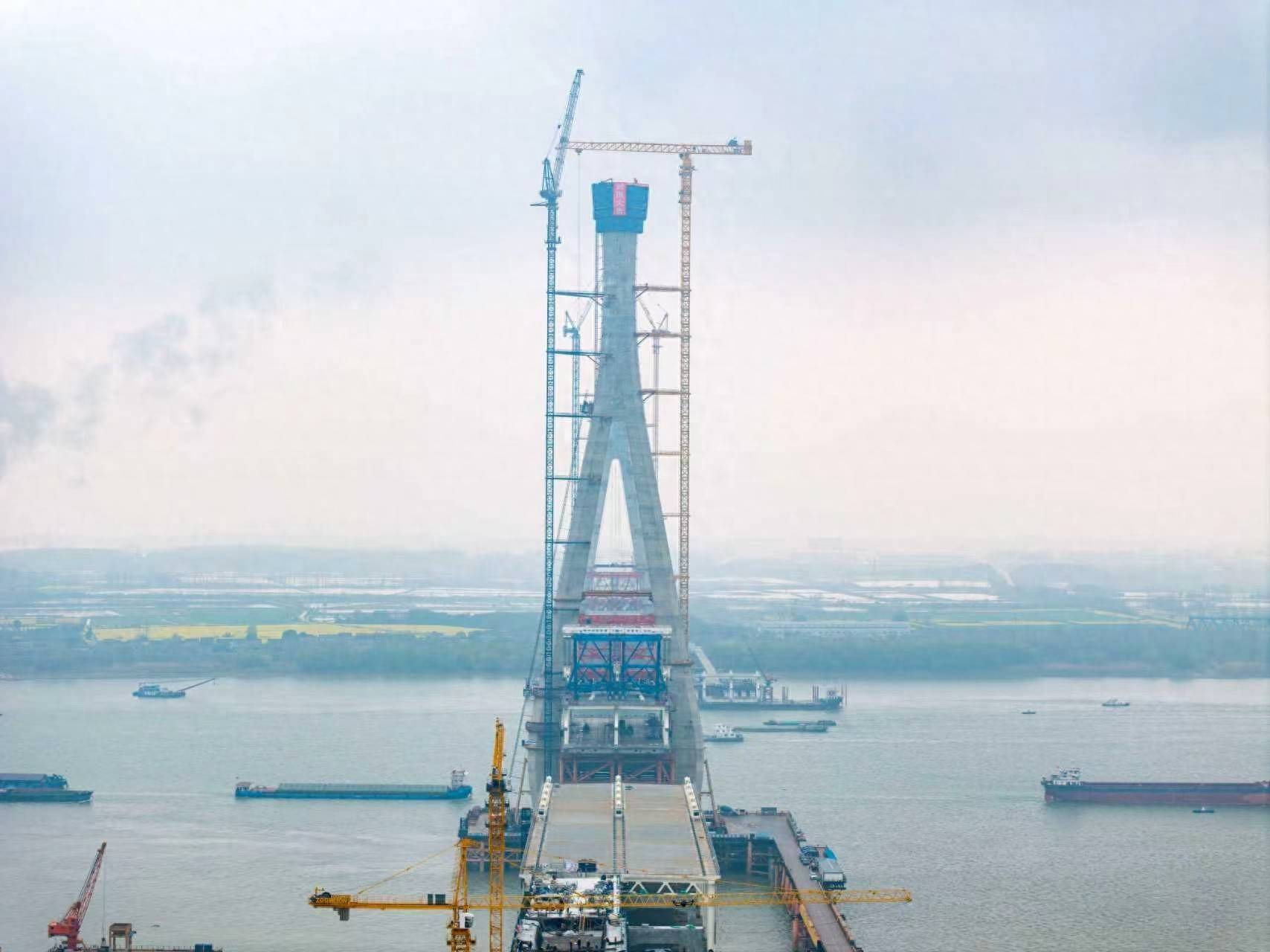 大桥设有两座主塔,其中4号南主塔高272.7米,3号北主塔高282.7米,均为造型优美的空间钻石型钢筋混凝土桥塔,有“天空之桥”的美誉。此次封顶的3号北主塔共设为47节浇筑,作为未来大桥的“脊梁”,它将和南主塔一起,通过324根钢索,稳稳承载起全长1768米、主跨812米的双层钢桁梁桥面,让汽车、高铁与城际列车在70米高空并行穿梭。