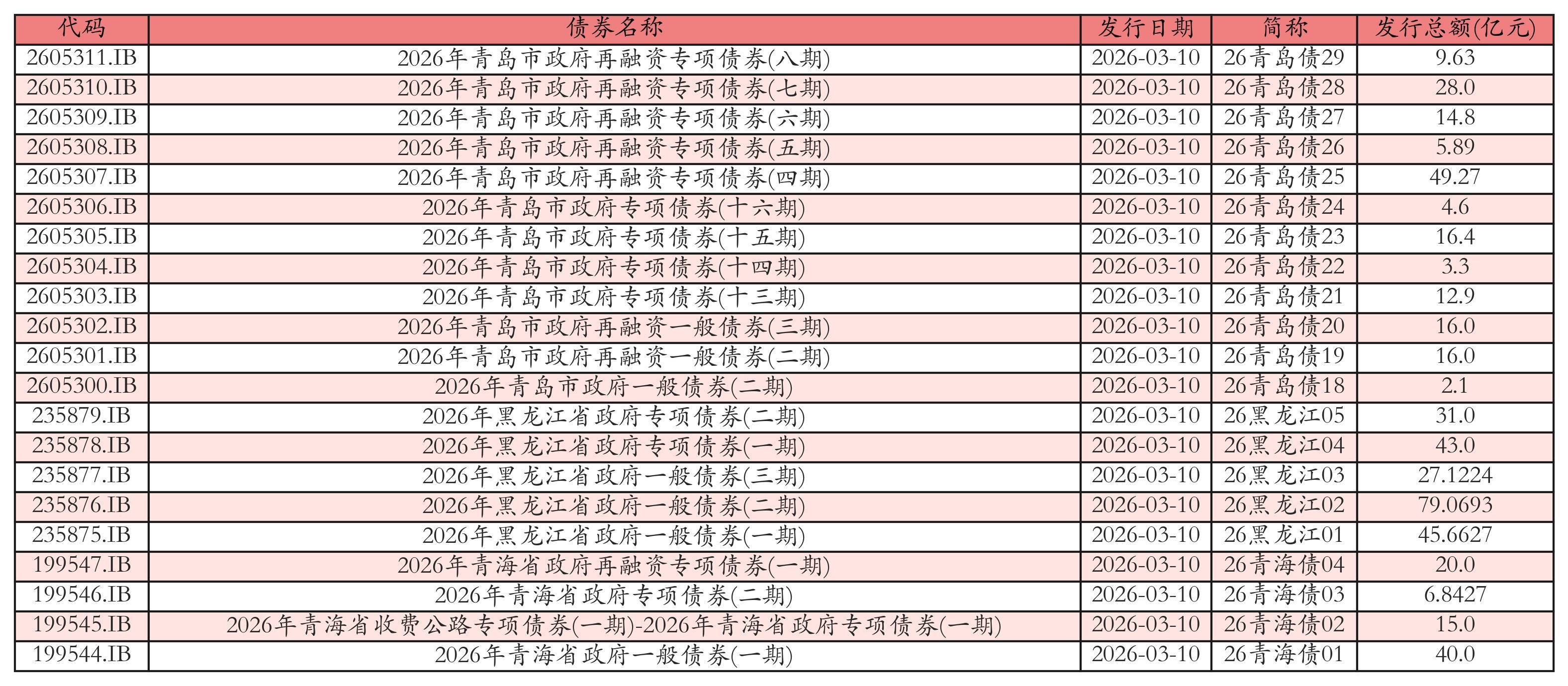 南财智讯3月10日电,盘后数据显示,2026年3月10日全国共发行21只地方政府债,共计486.5871亿元。其中散户配资网,政府一般专项债发行7只散户配资网,共225.9544亿元;地方政府专项债发行14只,共260.6327亿元。各地方政府所发行债券中,26青岛债25、26青海债01、26黑龙江02发行规模靠前,发行金额分别为49.27亿元、40.0亿元、79.0693亿元。投标方面,各地方政府所发行债券中,26青岛债25、26青海债01、26黑龙江02全场中标倍数靠前。其中:26青岛债25全场中标倍数为16.85,全场中标利率为1.97%,边际倍数为1.94;26青海债01全场中标倍数为20.31,全场中标利率为1.81%,边际倍数为1.41;26黑龙江02全场中标倍数为19.9,全场中标利率为1.94%,边际倍数为1.35。今日发行地方政府债详情如下表:
