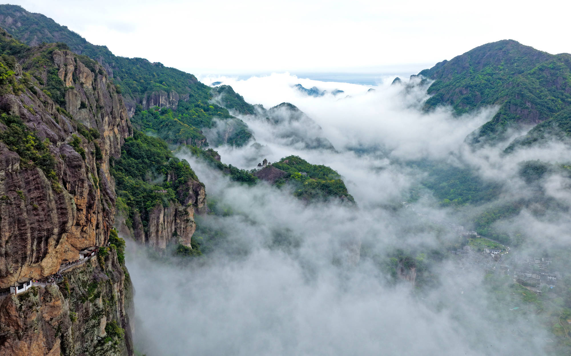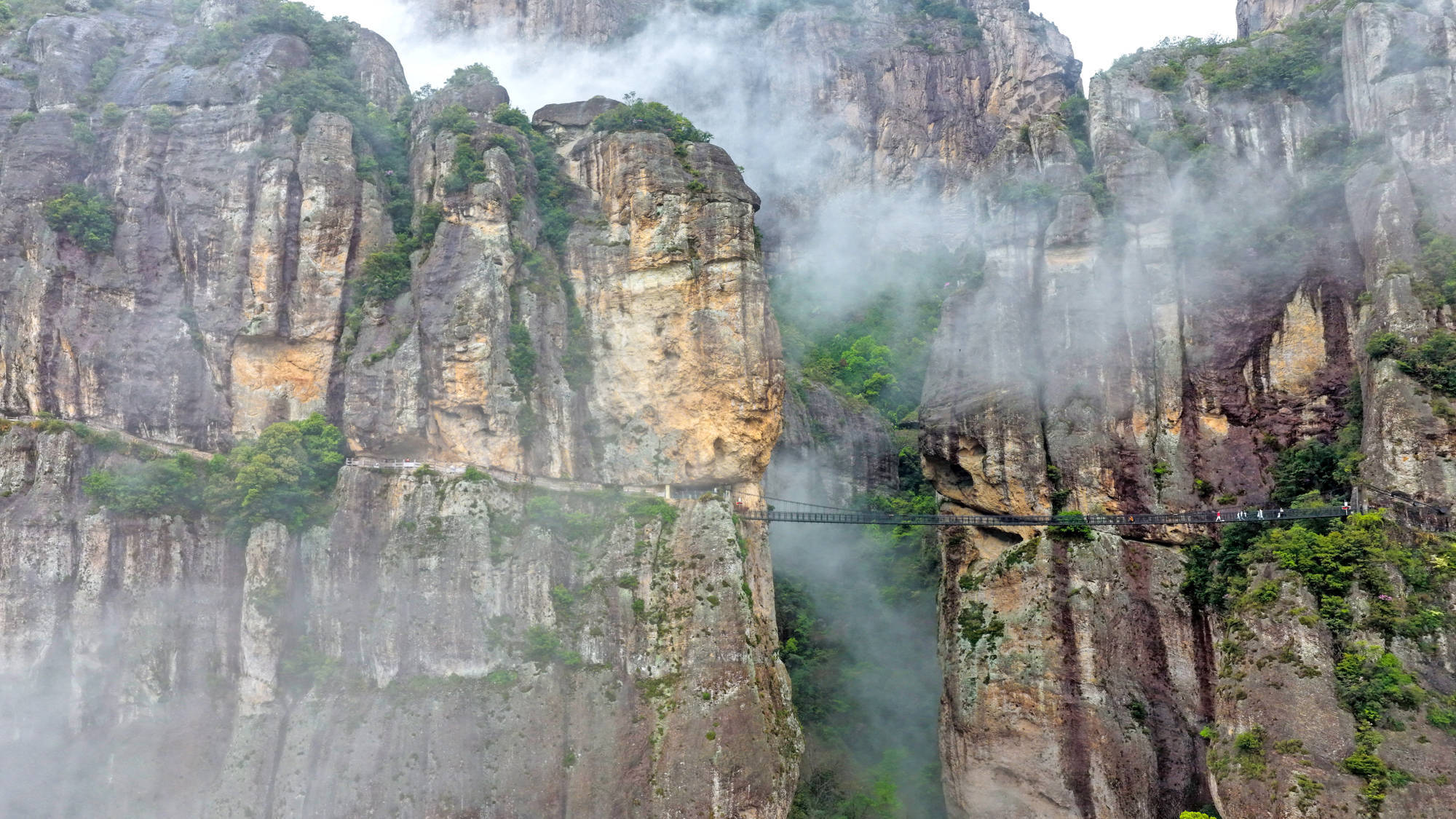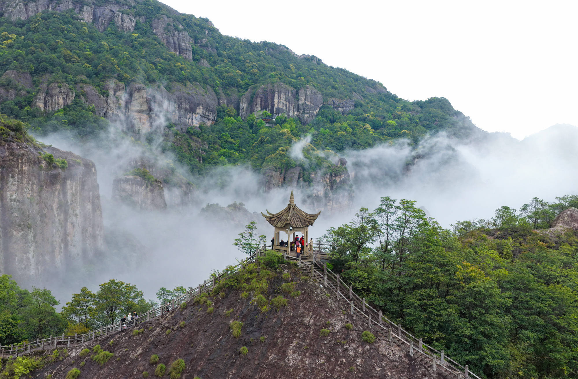 ↑2026年4月12日,游客在浙江省温州市雁荡山方洞景区观光游览。(无人机照片)CICPHOTO/段俊利 摄
